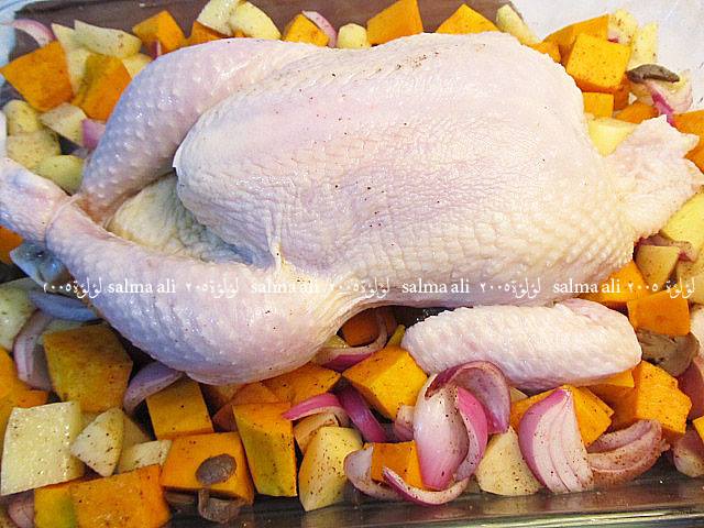 - بعد المدة يغسل الدجاج ويصفى ويدهن بالزيت، ويشوى بالفرن بعد تغطيتة لساعة ونصف.