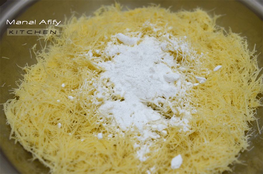 - نحضر نصف كيلو كنافة تفتت جيداً ونضيف عليها عدد 2 ملعقة كبيرة من السمن السايح، وملعقتين كبيرتين من السكر البودرة وتقلب جيداً ثم تقسم الكمية لنصفين.